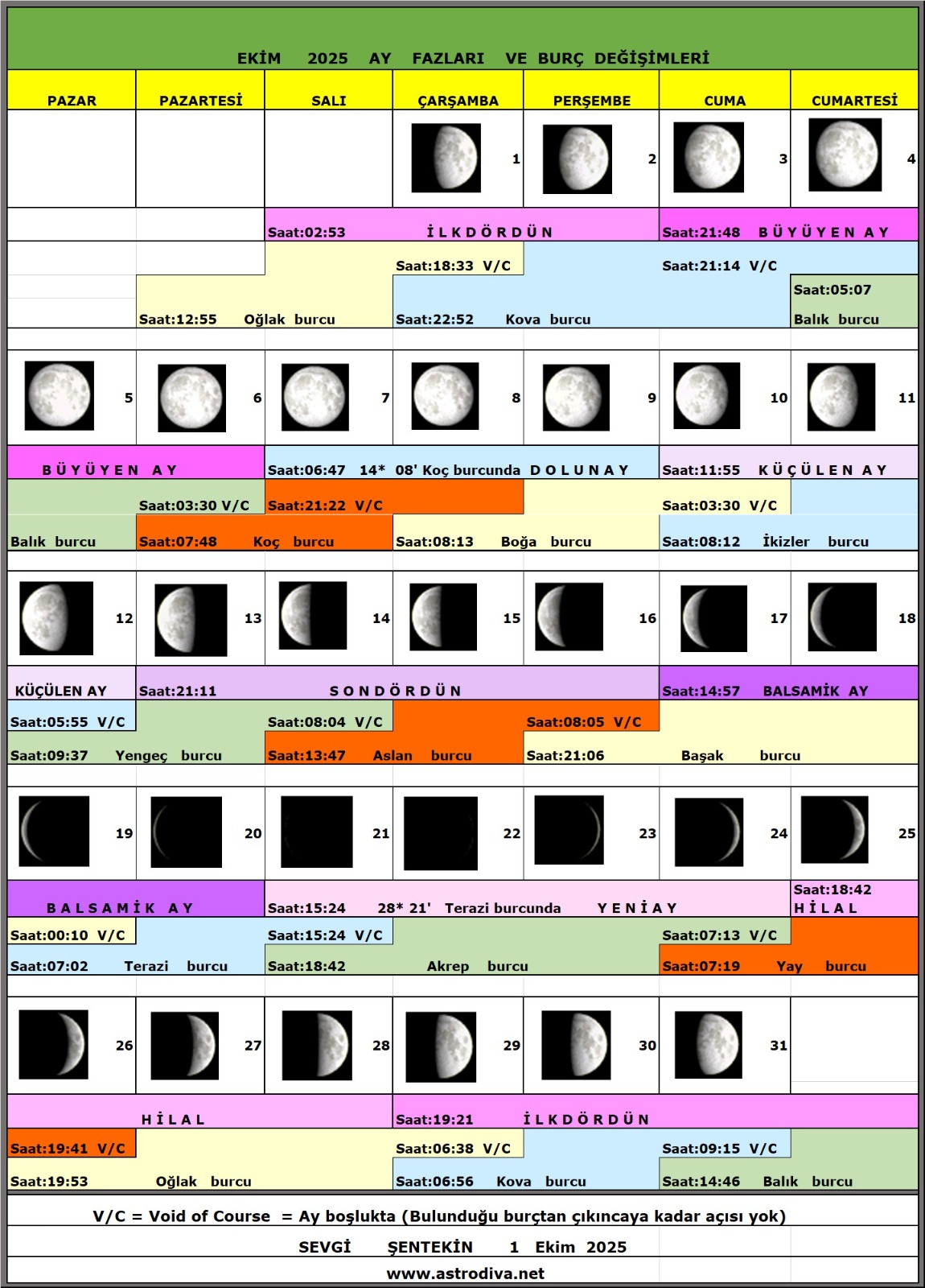 Ekim ayında yeni girişim, diyet, tatile çıkma, bitki yetiştirme gibi bütün aktivitelerinizde takip edebilmeniz için aşağıdaki Ay Fazları tablosundan Ay’ın burç değiştirmelerini ve Güneş’le ilişkisini göz önüne almanızda fayda var.